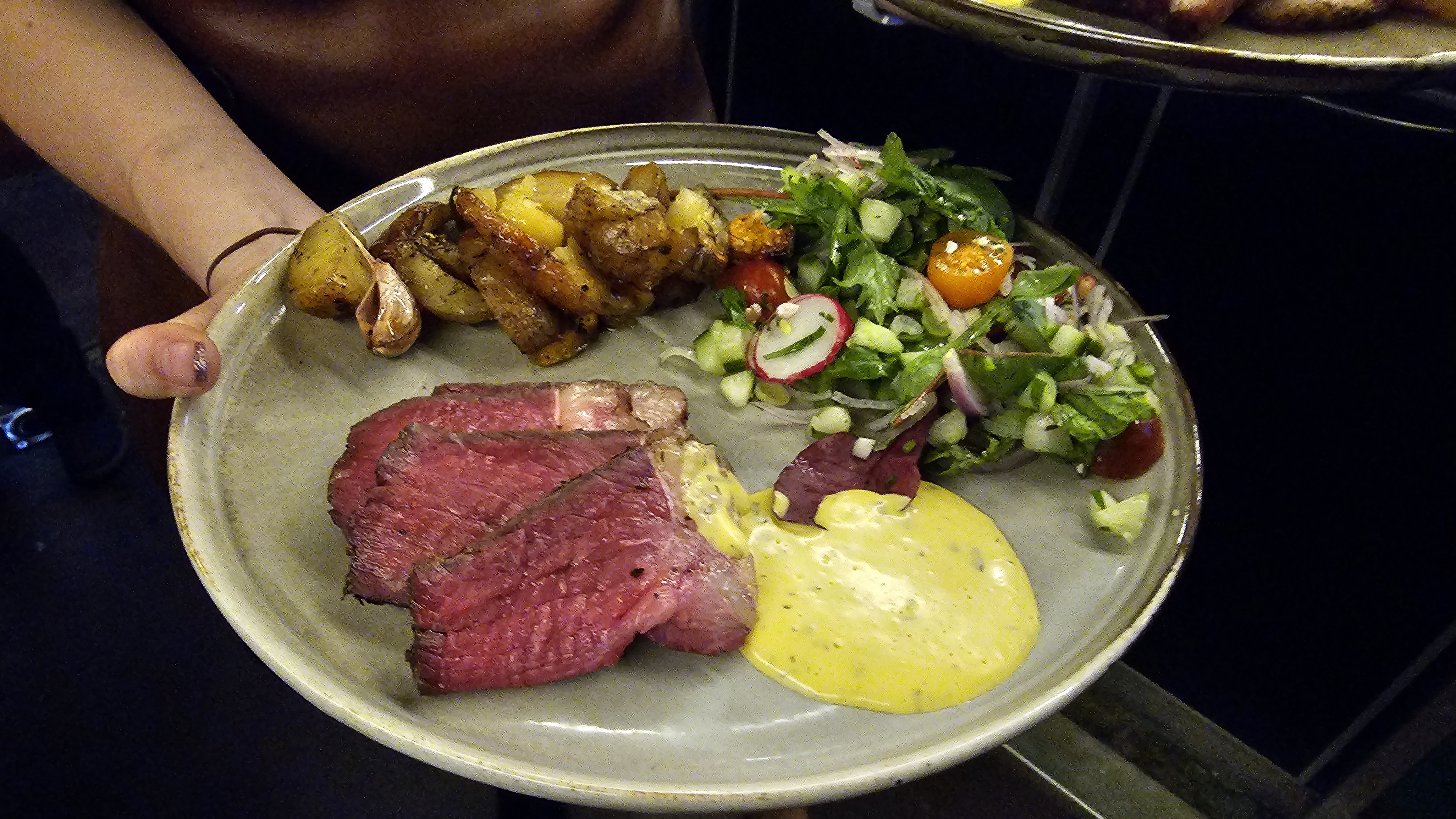 - Hoofdgerechten: assortiment van 3 stukken vlees en 1 stuk dagverse vis op het vel gebakken, gecombineerd met 3 koude Ottolenghi-salades en warme krielaardappeltjes